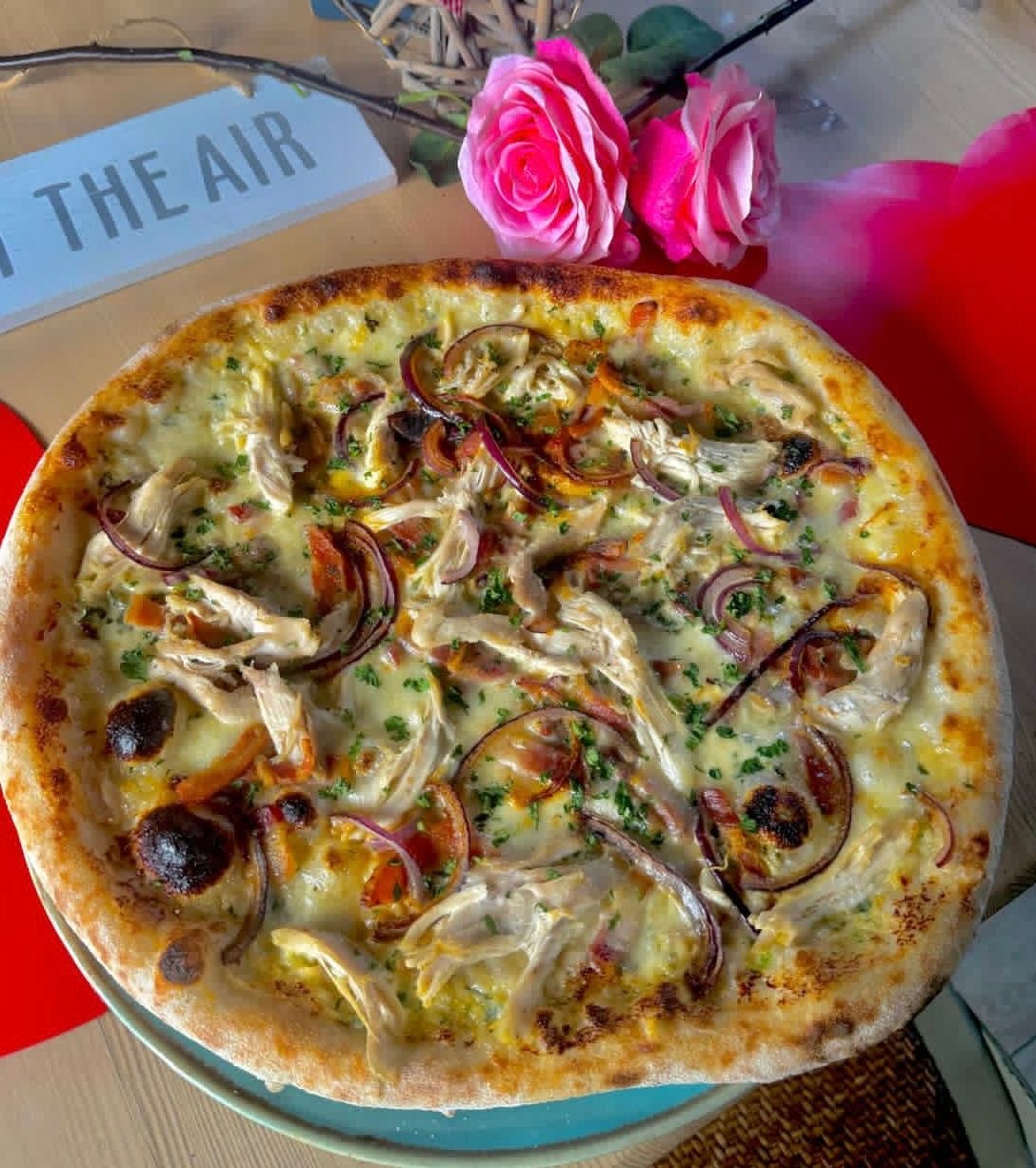 PIZZA OF THE MONTH CUPID’S CHICKEN Alfredo Sauce Base, Mozzarella, Roast Chicken, Crispy Bacon, Red Onion, Parsley